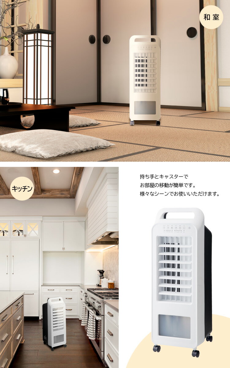 商品名 冷風扇 エアクールファン サイズ 約 幅26×奥行30.5×高さ72cm 重 量 約 4.5kg 材 質 PP、ABS樹脂 電 源 AC100V 50/60Hz 機 能 ●風量3段階(強・中・弱) ●オフタイマー(1・2・4・8時間) ●スイング【左右自動ルーバー(約80°)、上下ルーバー(手動調節)】 ●モード切替(送風モード、自然風モード、おやすみモード、乾燥モード、涼風モード) 消費電力 45W コード長 約 1.5m 水タンク容量 約 5.5L 付属品 ●リモコン(テスト用ボタン電池CR2032付属) ●保冷タンク ●キャスター×4 ※組み立て式になります。