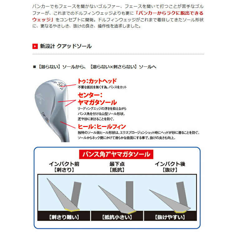 バンカーでもフェースを開かないゴルファー、フェースを開いて打つことが苦手なゴルファーが、これまでのドルフィンウェッジよりも更に「バンカーからラクに脱出できるウェッジ」をコンセプトに開発。