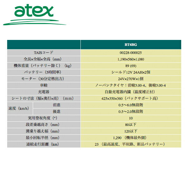【配送方法を選択ください】【カラーを選択ください】 ●全長×全幅×全高(mm) 1,190×560×1,080 ●機体重量(バッテリー除く)(kg) 89 (69) ●バッテリー(5時間率) シールド12V 24AH×2個 ●モーター(30分定格出力) 24V×270W×1個 ●車輪 ノーパンクタイヤ:前輪3.00-4、後輪3.00-4 ●充電器 自動充電器内臓(温度補正付) ●シートの寸法(幅×奥行×高)(mm) 425×350×360(バックサポート高) ●速度(km/h) 前進 0.5〜6.0無段階 後進 0.5〜2.0無段階 ●実用登坂角度(°) 10 ●段差乗越高さ(mm) 80以下 ●溝乗り越え幅(mm) 120以下 ●最小回転半径(mm)1,290 (機体最外側) ●連続走行距離(km) 23 (最高速度、平坦路、新品バッテリー)
